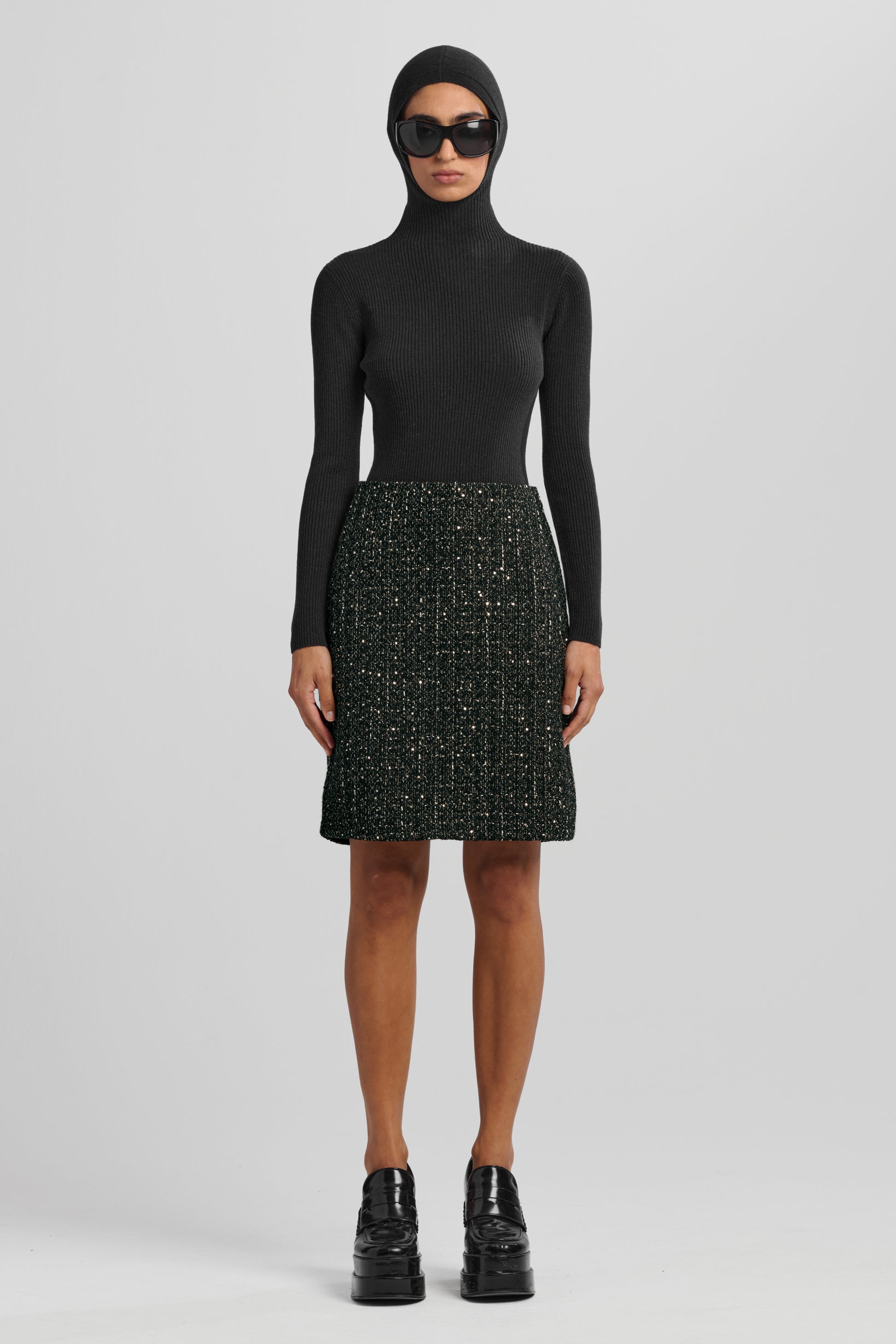 Designed to catch the light and elongate the silhouette, the Yara Skirt is cut high at the waist before falling to an elegant mid length above the knee. Its black-gold sequin finish brings dimensional shimmer, while a concealed zip and full lining ensure a smooth, comfortable fit.