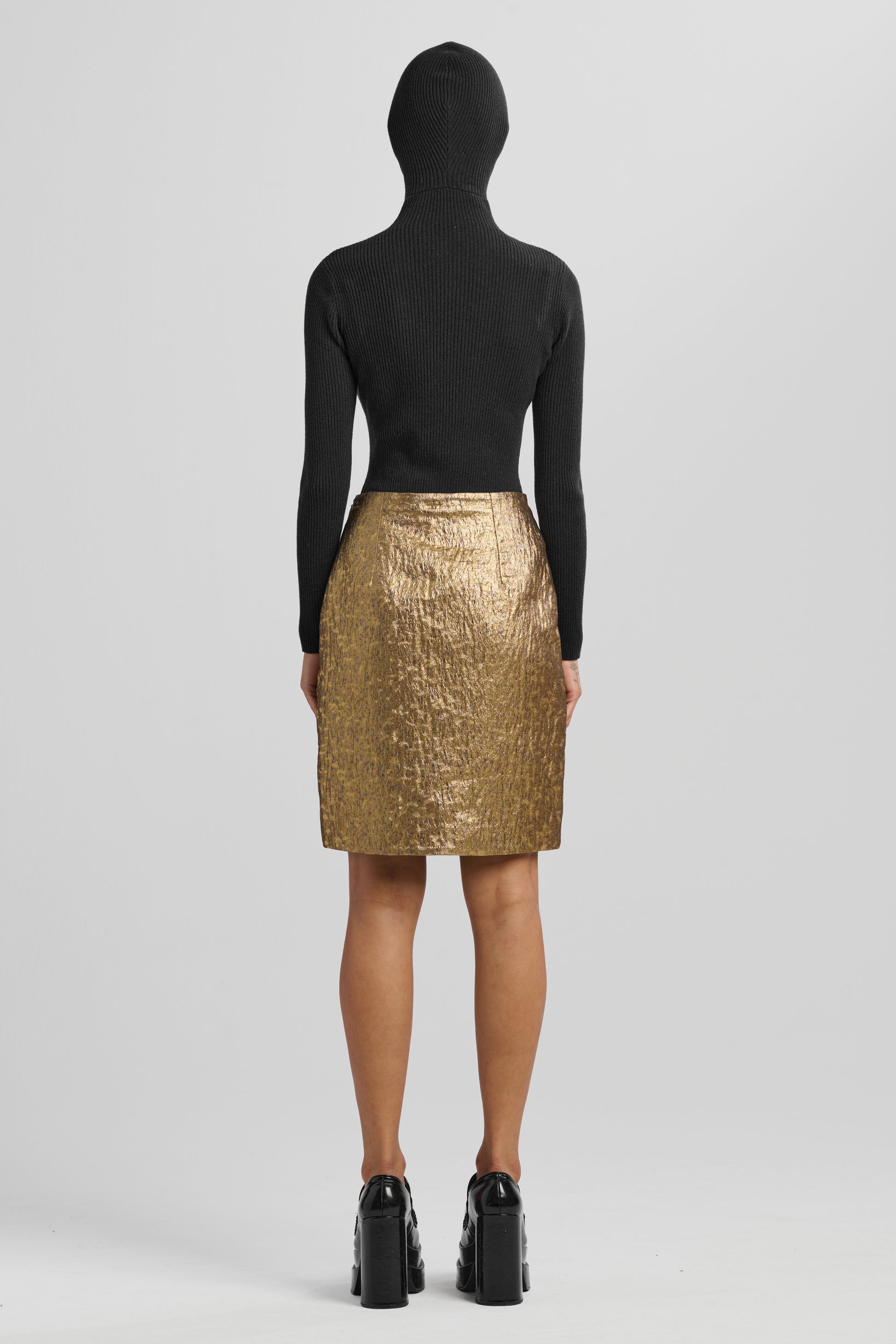 The Yara Skirt in Gold brings a soft luminosity to a striking silhouette. Cut to sit high at the waist and fall to an elegant mid-length above the knee, it’s made from metallic hammered look elevated polyester that shimmers with every step. Elegant yet easy to wear, it’s fully lined for comfort and ideal for any occasion.